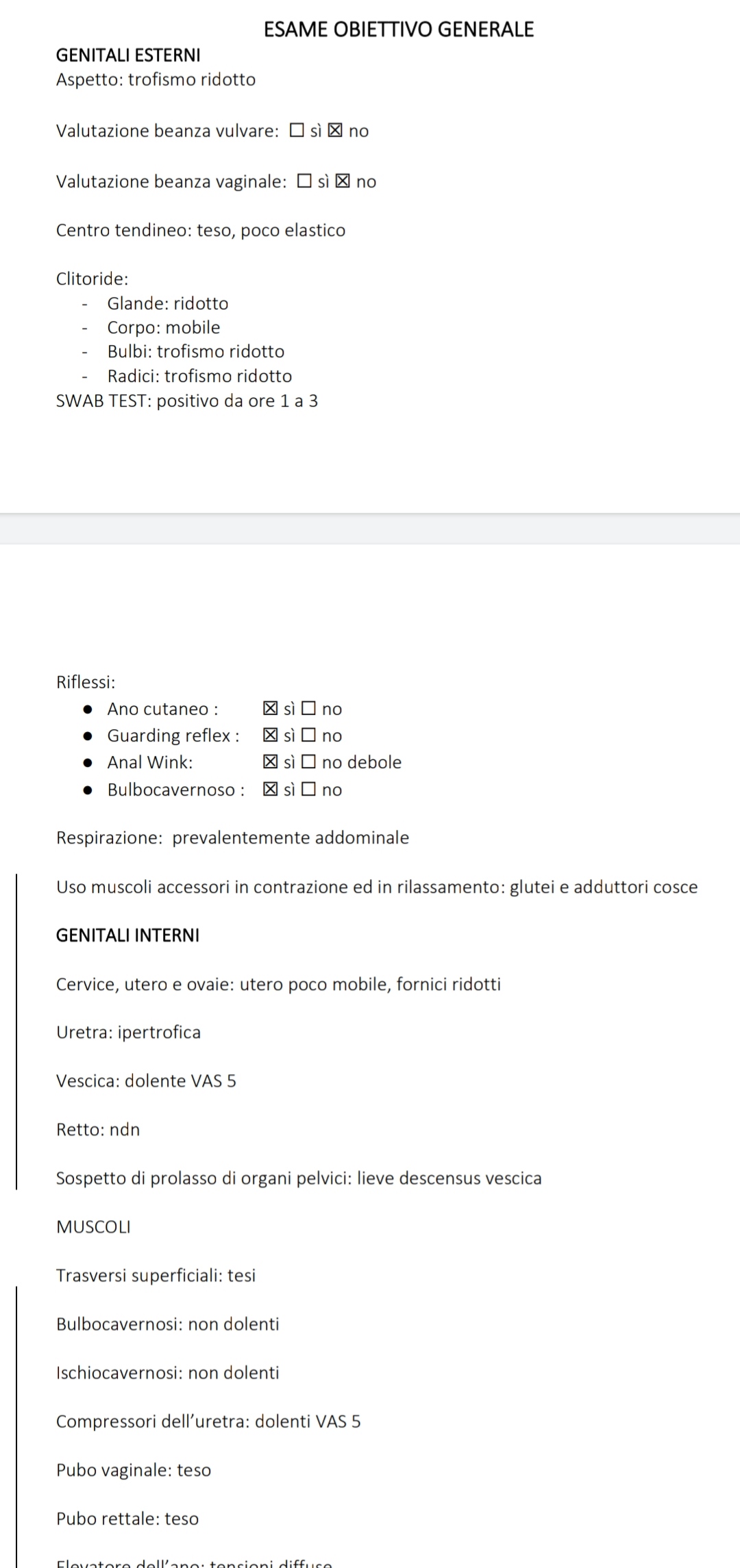 La visita inizia con una serie di domande (mestruazioni, rapporti sessuali,come si va in bagno,come sono materialmente pipì e feci,ecc ..)